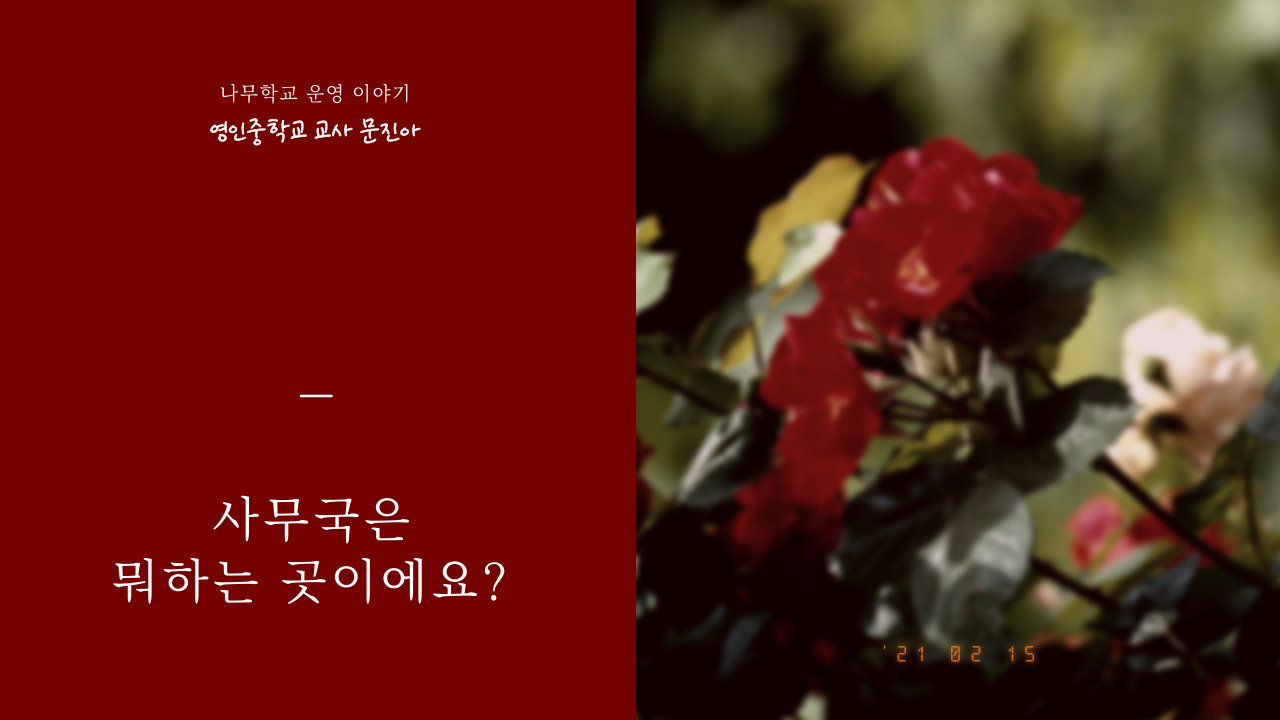 예전에 제가 한 선생님께 질문을 던진 적이 있습니다. “나무학교가 돈을 주는 것도 아니고, 나는 왜 이게 재밌을까. 나는 왜 나무학교를 계속 하고 싶을까.” 스스로 궁금할 때가 있다고요. 그 선생님은 “우리가 하고 싶은 것을 하고, 그것이 이루어지기 때문이 아닐까 생각한다.”라고 했습니다. 나무학교에서는 우리의 배움과 성장을 위해 끊임없이 고민합니다. 교육을 위한 다양한 시도가 이루어지고, 교실과 학교의 변화를 만들어가기 위해 함께 노력합니다. 그리고 이러한 모든 것을 기획하고 연결하는 곳이 사무국입니다.