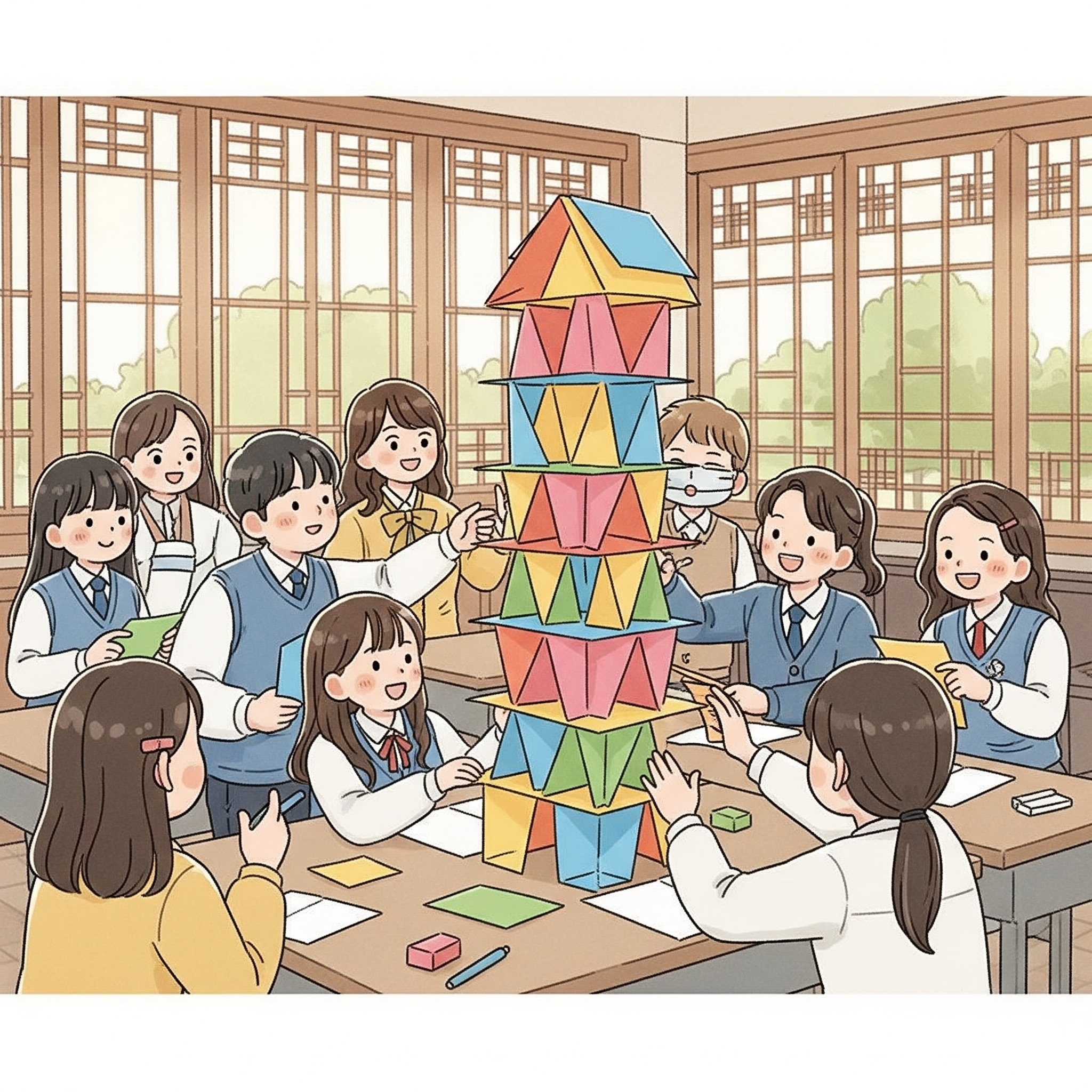 첫 번째로는 4명의 모둠원이 서로 다른 색의 종이를 이용하여 탑을 쌓는 ‘종이 탑 쌓기’ 활동이다. 3분 동안 모둠원들은 자신 앞의 종이를 건드리지 않는 상태로 종이를 어떻게 쌓을지 협의하도록 했다. 준비시간이 지난 후에 5분간 가장 높고 안정적인 탑을 쌓는 팀이 우승하게 되는 게임이다. 여기서 가장 먼저 중요한 규칙은 자신의 종이는 자신만이 만질 수 있다는 것이다. 이로써 탑을 쌓기 위해서는 다른 모둠원과의 소통과 협업이 매우 중요하게 된다. 이 활동을 통해 모둠원들은 팀이라는 공동체 의식과 다른 모둠원과 긍정적 상호작용을 경험할 수 있게 되었다.