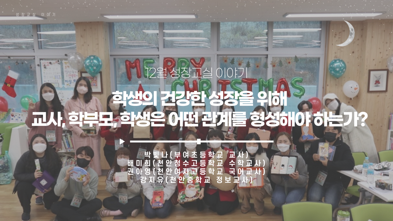 12월 성장교실은 ‘교사가 행복하기를’ 바라며 준비한 프로그램이었습니다. 한 해 동안 12월 조의 발표자들부터가 너무 다채로운(?) 한 해를 보냈기에, 학교에서 받는 상처에 대한 원인을 알아보고 이를 치유할 수 있는 시간이 되었으면 좋겠다고 생각했습니다. 성장교실을 준비하면서 저희도 저희의 마음을 돌아보고, 더 나은 미래를 꿈꿀 수 있는 힘을 얻었거든요. 저희의 바람이 참여해주신 선생님들께 모두 가 닿았는지는 모르겠지만, 성장교실에서 얻은 힘을 바탕으로 2022년의 힘든 일들도 잘 헤쳐 나가시고 선생님과 아이들 모두 행복한 교실을 만드시기를 진심으로 기원합니다. 마지막으로, 제일 먼저 앞장서서 저희를 도와주신 퍼실 선생님들께 정말 감사하다는 말씀을 드리며 2021년 성장교실의 문을 닫습니다.