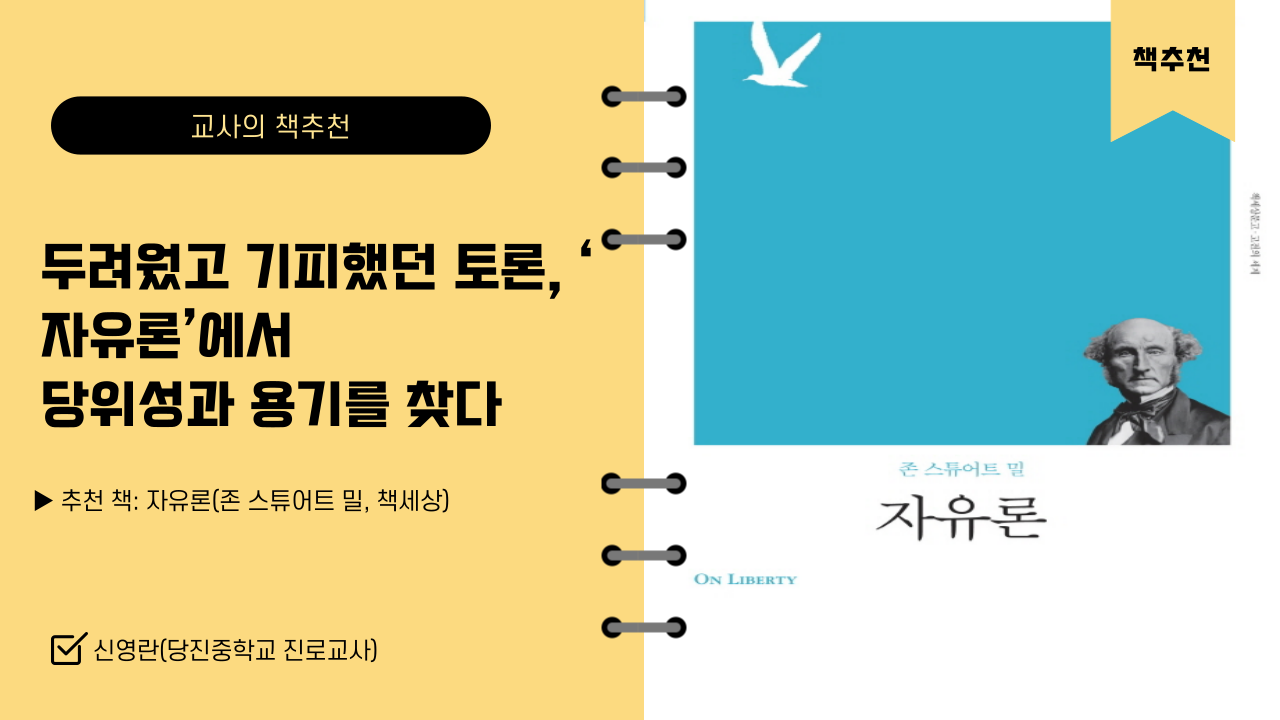토론의 장을 경험해보는 것만으로도 아이들 마음속엔 겨자씨와 같은 무수히 많은 깨달음이 있을 수 있다는 이 말에 토론 수업을 도입할 용기를 가져봅니다. 사실 저는 별로 토론을 많이 겪어보지 못한 세대입니다. 학창 시절부터 수직적 문화 풍토에 젖어서 이런 문화가 이상하게 느껴지진 않습니다. 하지만 밀의 말처럼 진정한 자유란 개별성이 발휘되는 사회이고 그것이 민주적인 토론이 가능한 사회에서부터 시작되는 것이라면, 학교 현장에서부터 변화가 시작되어야 함을 깊이 공감합니다. 교실 수업과 학급 회의에서부터, 나아가 교직원 회의, 전교 학생 회의, 크게는 직장, 가정, 사회에까지 많은 의사결정 과정에서 민주적이고 수평적인 문화가 정착되어 한 명 한 명의 존재가 모두 존중받는 사회가 되길 바랍니다.