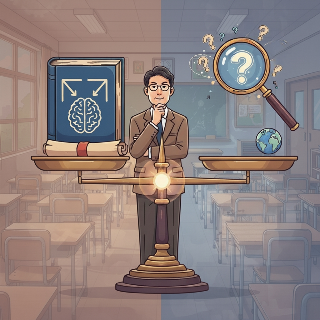 마지막으로 독자 여러분께 질문을 던지며 글을 마칩니다. 두 연구팀 모두 '아무런 지도(안내) 없이 방치하는 식의 학습'은 문제가 있다는 점에 동의합니다. 그렇다면 교실에서 교사의 가장 중요한 역할은 무엇일까요? 학생의 '생산적인 어려움'과 학습을 저해하는 '과도한 인지 부하'를 구분하는 교사의 눈은 어떻게 길러질 수 있을까요? 학생이 도움을 요청하기 전, 우리는 언제, 어떻게 개입하여 최적의 비계를 제공하는 '교육 전문가'가 될 수 있을까요?
