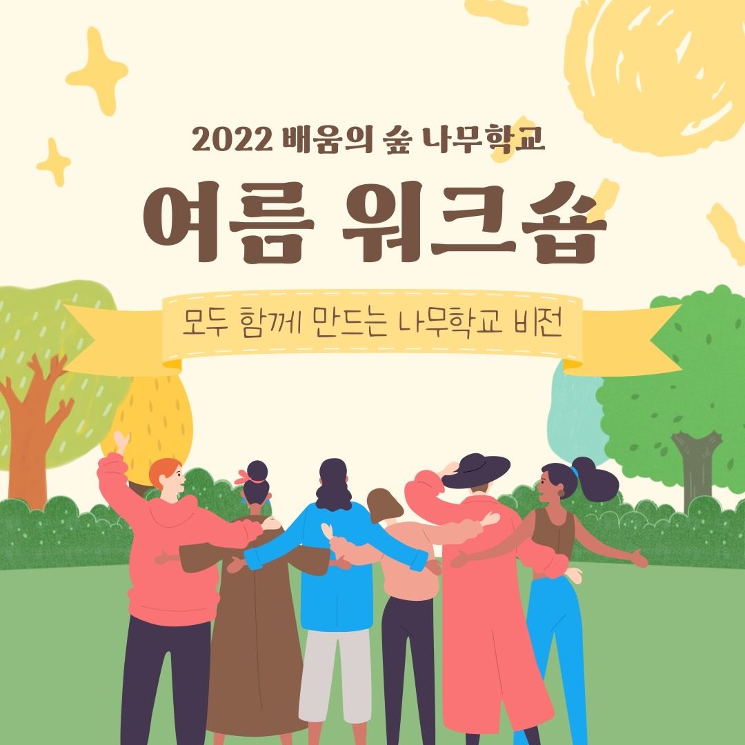 나무학교에서 배움과 실천을 이어나가고 계시는 모든 선생님들, 안녕하신가요? 수업캠프에서 선생님들과 경험했던 감동과 여운을 이어받아, 2022 배움의 숲 나무학교 여름 워크숍 을 개최하고자 합니다. 이번 여름 워크숍에서는 ‘배움의 숲 나무학교의 공유비전’ 을 함께 세워보는 시간을 가집니다.